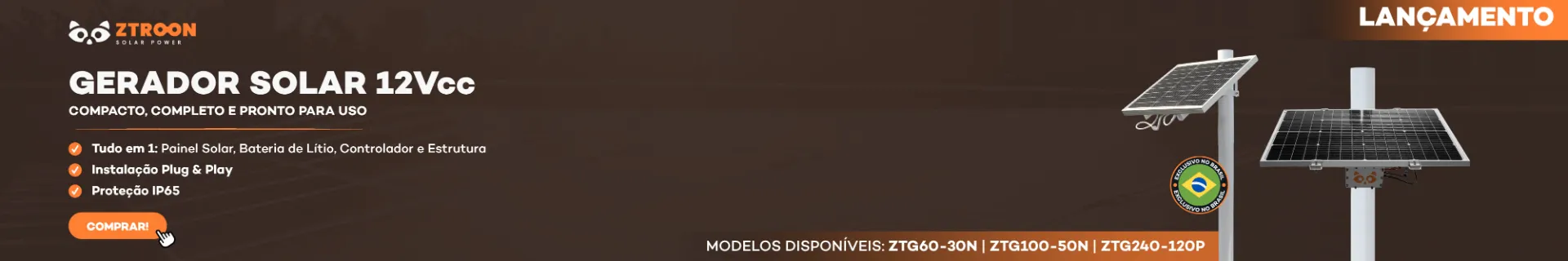 Painel Solar 100W ZTROON com 30 células de silício monocristalinos. Gera até 500Wh/dia em condições de STC e possui garantia de 12 anos contra defeito de fabricação